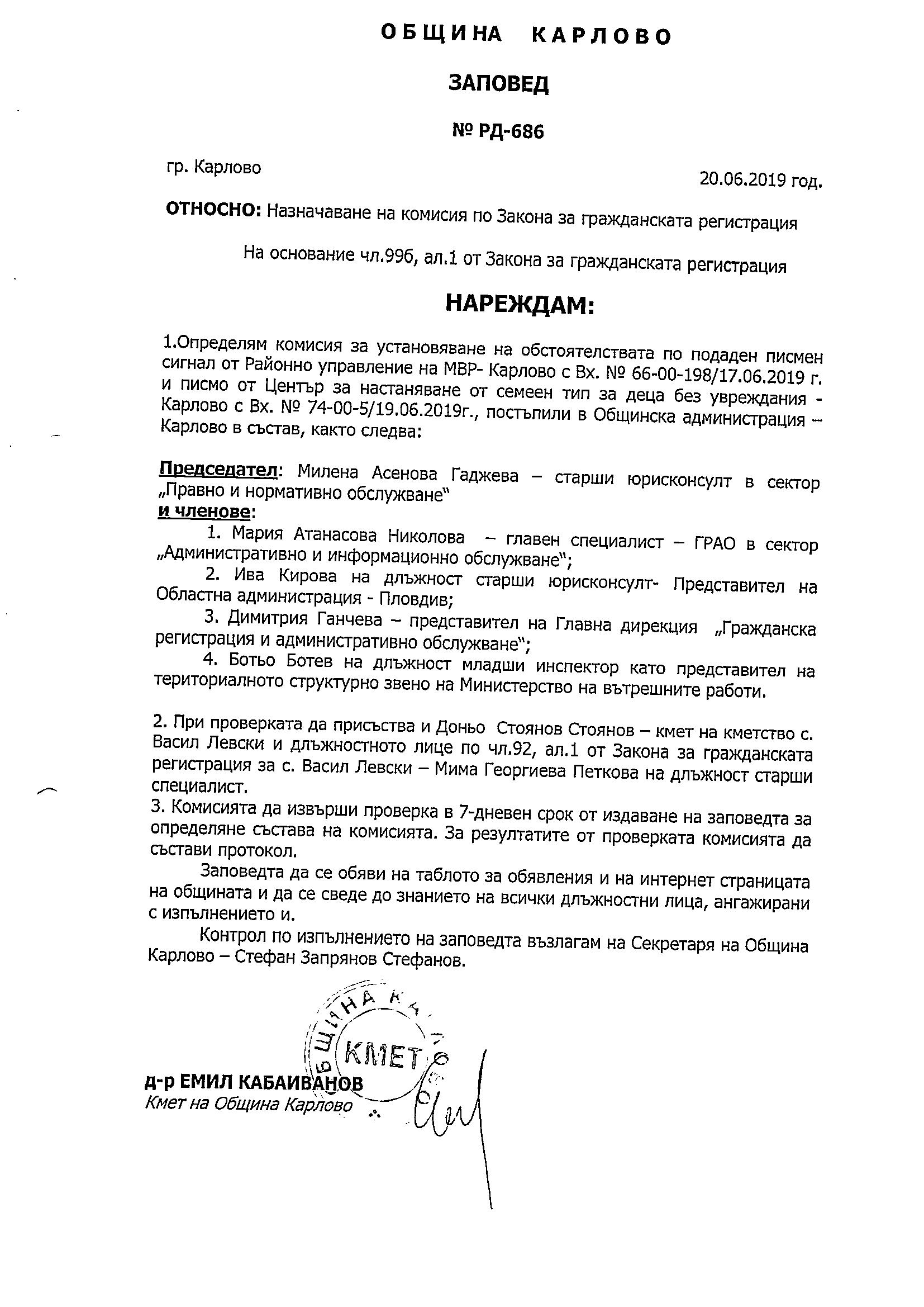 Заповед РД-686/20.06.2019 Относно: Назначаване на комисия по Закона за гражданската регистарция