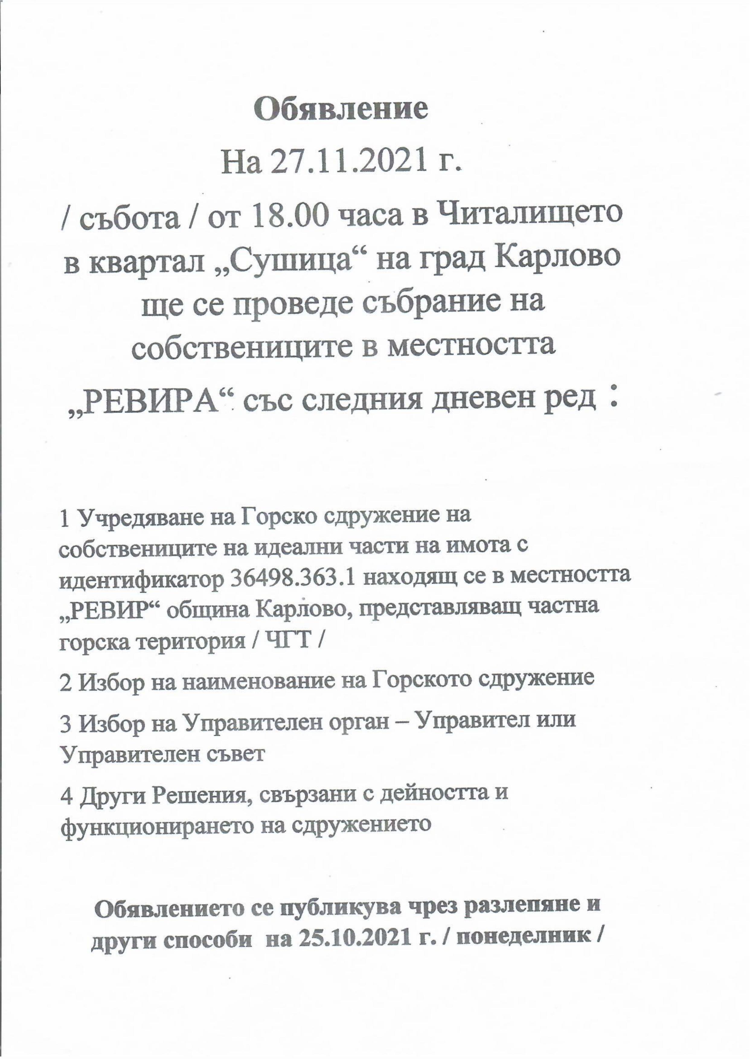 Обявление за събрание на собствениците в местността "РЕВИРА"