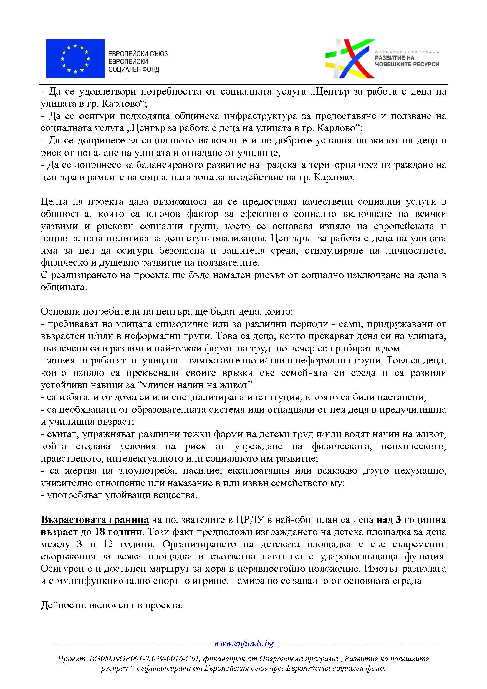 Проект № BG05M9OP001-2.029-0016-C01 „Център за работа с деца на улицата в гр. Карлово”, по процедура чрез директно предоставяне на безвъзмездна финансова помощ BG05M9OP001-2.029 „Интегрирани действия за устойчиво градско развитие“ по Оперативна програма „Развитие на човешките ресурси” 2014 – 2020.