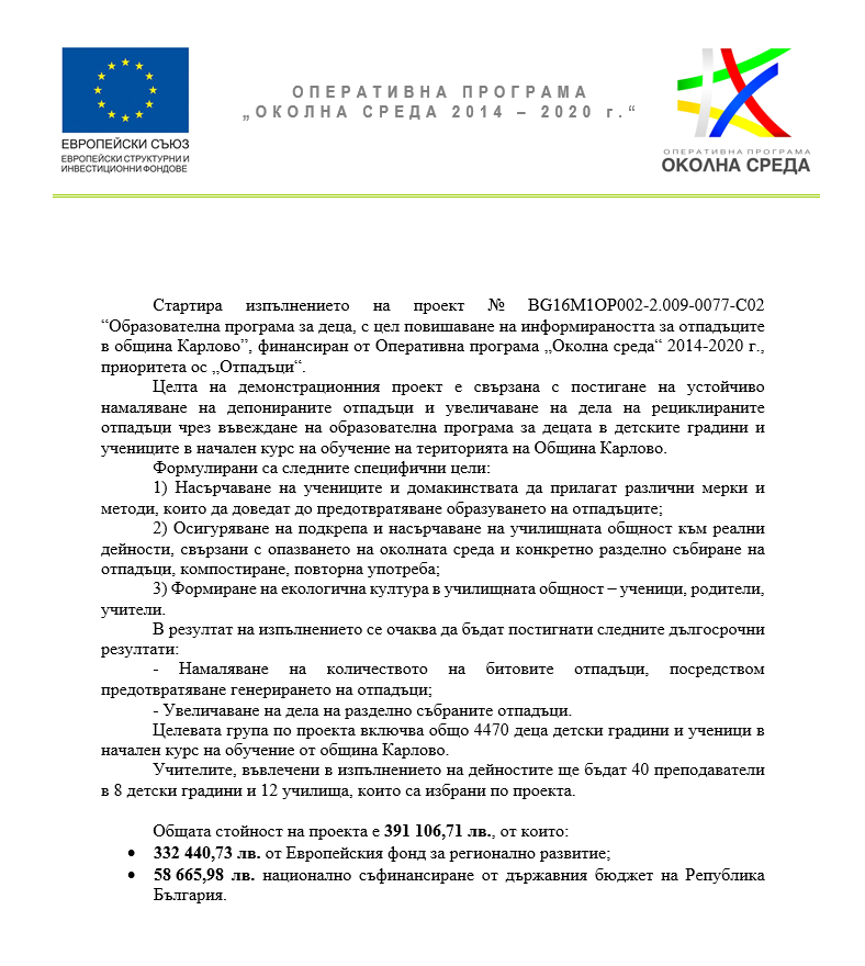Проект № BG16M1OP002-2.009-0077-C02 “Образователна програма за деца, финансиран от Оперативна програма „Околна среда“ 2014-2020 г.