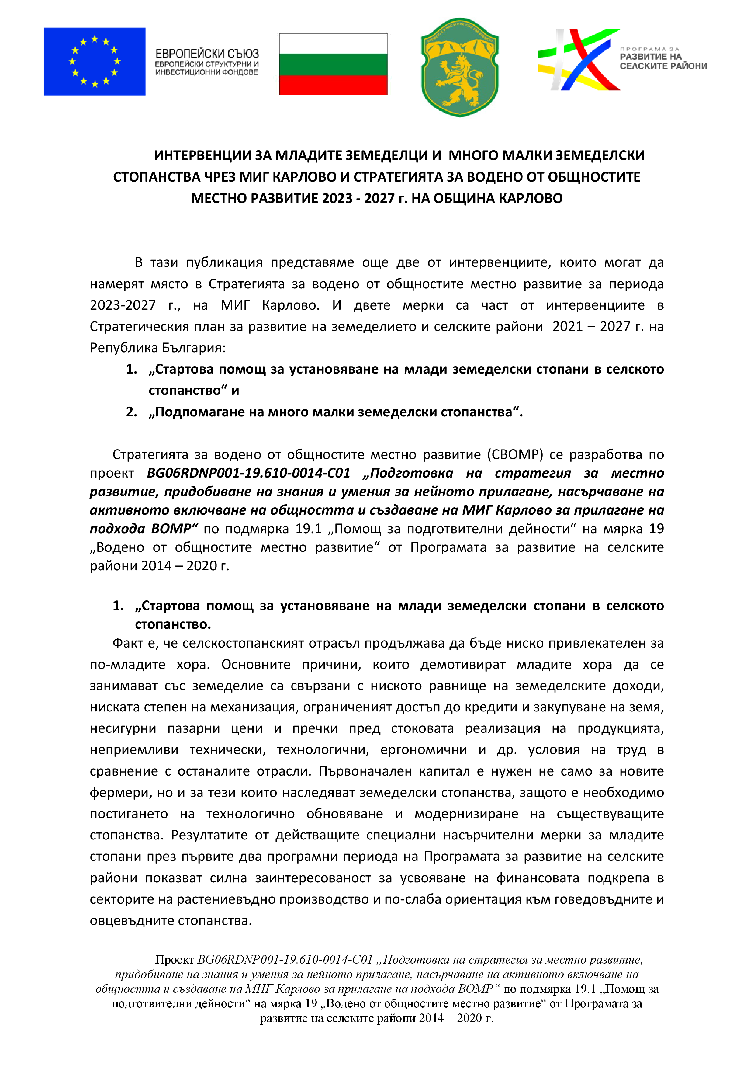 ИНТЕРВЕНЦИИ ЗА МЛАДИТЕ ЗЕМЕДЕЛЦИ И МНОГО МАЛКИ ЗЕМЕДЕЛСКИ СТОПАНСТВА ЧРЕЗ МИГ КАРЛОВО И СТРАТЕГИЯТА ЗА ВОДЕНО ОТ ОБЩНОСТИТЕ МЕСТНО РАЗВИТИЕ 2023 - 2027 г. НА ОБЩИНА КАРЛОВО