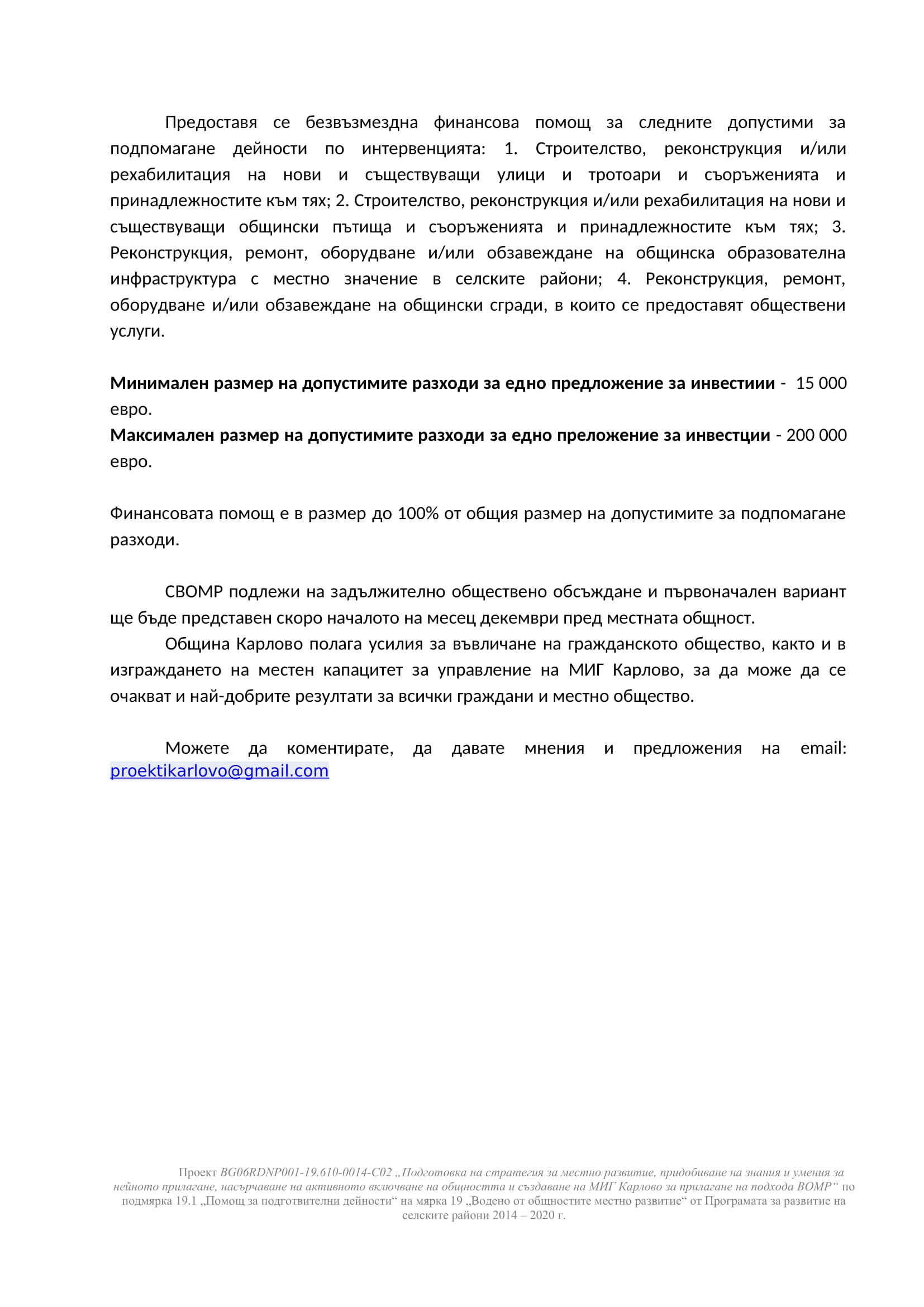 Стратегията за водено от общностите местно развитие (СВОМР) се разработва по проект BG06RDNP001-19.610-0014-C02 „Подготовка на стратегия за местно развитие, придобиване на знания и умения за нейното прилагане, насърчаване на активното включване на общността и създаване на МИГ Карлово за прилагане на подхода ВОМР“ по подмярка 19.1 „Помощ за подготвителни дейности“ на мярка 19 „Водено от общностите местно развитие“ от Програмата за развитие на селските райони 2014 – 2020 г., ще представи в няколко последователни публикации възможните интервенции, които биха могли да намерят място в Стратегията за водено от общностите местно развитие (СВОМР) за периода 2023 – 2027 г.