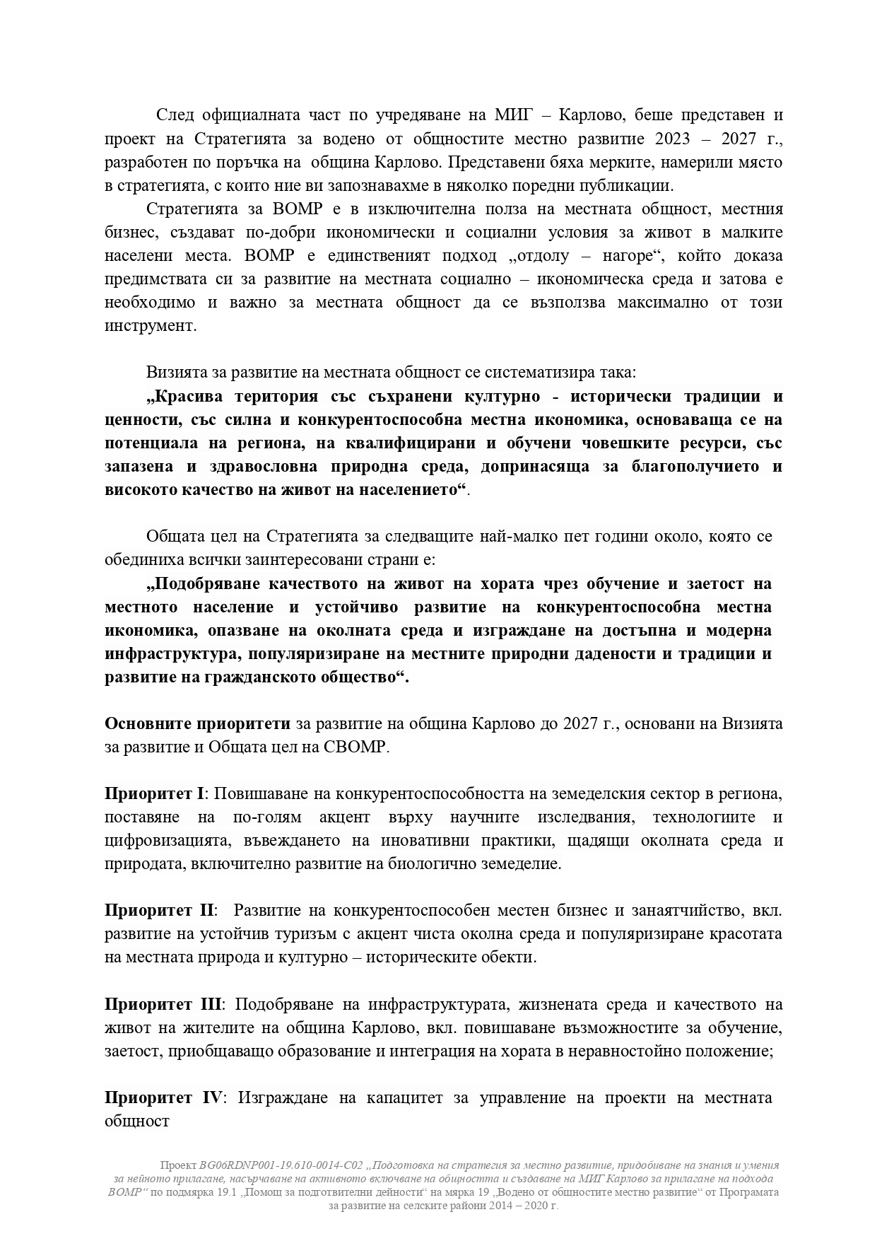 Проектът цели създаване на Стратегия за водено от общностите местно развитие (СВОМР) за периода 2023 – 2027 г., учредяване на Сдружение с нестопанска цел – „Местна инициативна група – Карлово“ (МИГ – Карлово), която да е водещ орган за прилагане на СВОМР, изграждане на местен капацитет за управление, мониторинг и подкрепа на местните общности.