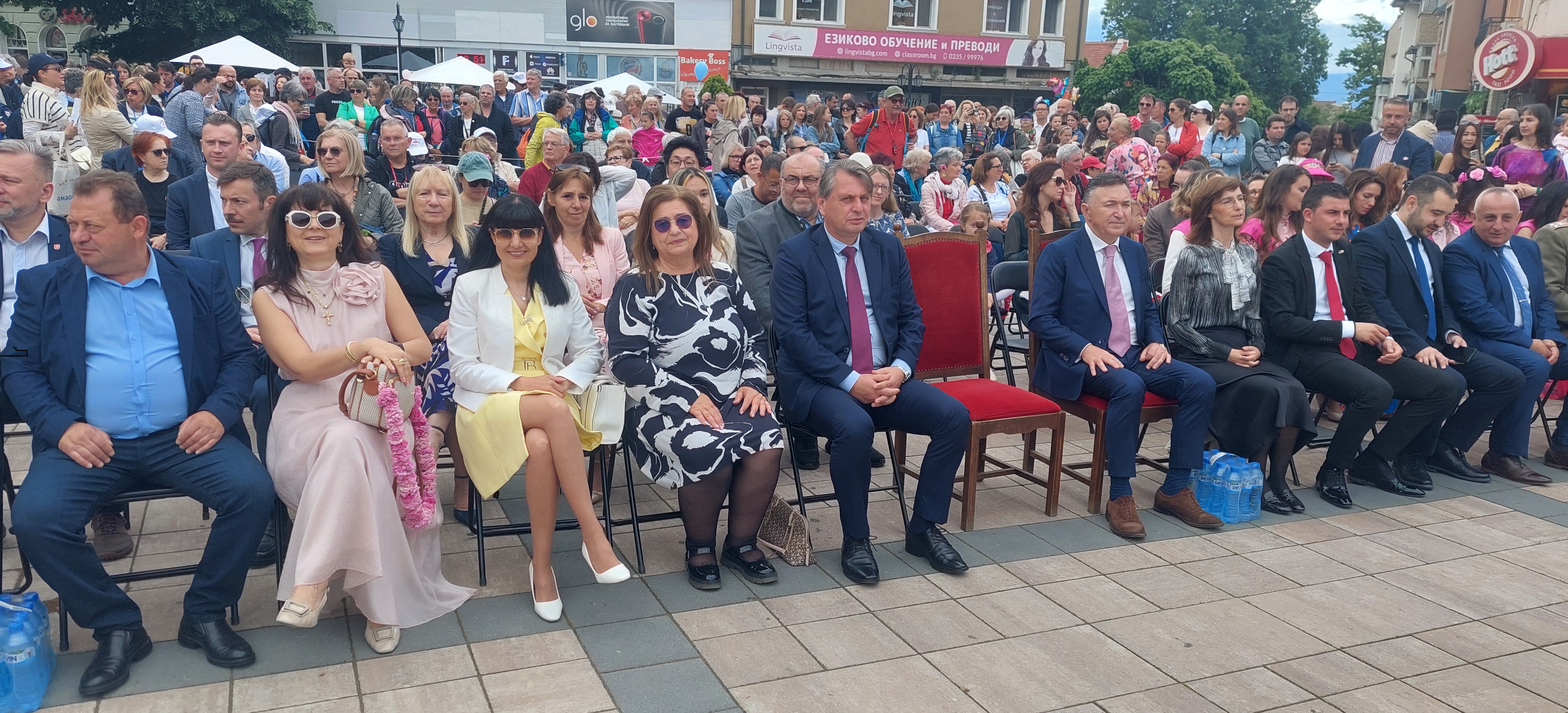 Приветствие отправи кметът на община Карлово д-р Емил Кабаиванов. „Скъпи съграждани, нека се чувстваме горди и нека самочувствието ни, което е оправдано, да нараства с този празник, защото – да ни почетат гости от партньорските градове в Европа, от Европейския парламент, от нашето Народно събрание, от българските държавни институции, гости от няколко континента… това говори едно: нашият град и Карловската долина на розите са известни в Европа и в света!.. Уважаеми гости на Празника на розата, ще ви кажа следното: хората от Карловския край от столетия отглеждат маслодайната роза. Отглеждат я като семеен бизнес, който и в добри, и в лоши селскостопански години осигурява прехраната на семействата им; средствата, с които те образоват своите деца… Ние, гражданите на Карлово и на цялата ни долина, се отнасяме с уважение и благодарност към всички, които сега, в не по-лека икономическа среда, продължават да отглеждат българската маслодайна роза. 2025-та е поредната година, в която благодарим и прекланяме глава пред стотиците карловци, които отглеждат рози. Пожелавам им да бъдат все така упорити, да са здрави и да имат успехи – те и техните семейства! Обръщам се към представителите на Европейския парламент с настойчива молба – нека интересите на розопроизводителите в Карловския регион, в цяла България да бъдат защитени! Сигурни сме, че ще направите всичко необходимо, за да може столетия след нас българската маслодайна роза да бъде емблема на красивата ни родина.“, каза д-р Кабаиванов. Той връчи на Царицата на розата един от символите на Карлово – 24-каратовата Златна роза. Никол да бъде посланик в България и в чужбина на красотата, на Розовата долина и на Карлово, пожела д-р Кабаиванов. Никол приветства стотиците, изпълнили площада, с добре дошли, пожела здраве и доброта и повели да бъде ден на радост и веселие.