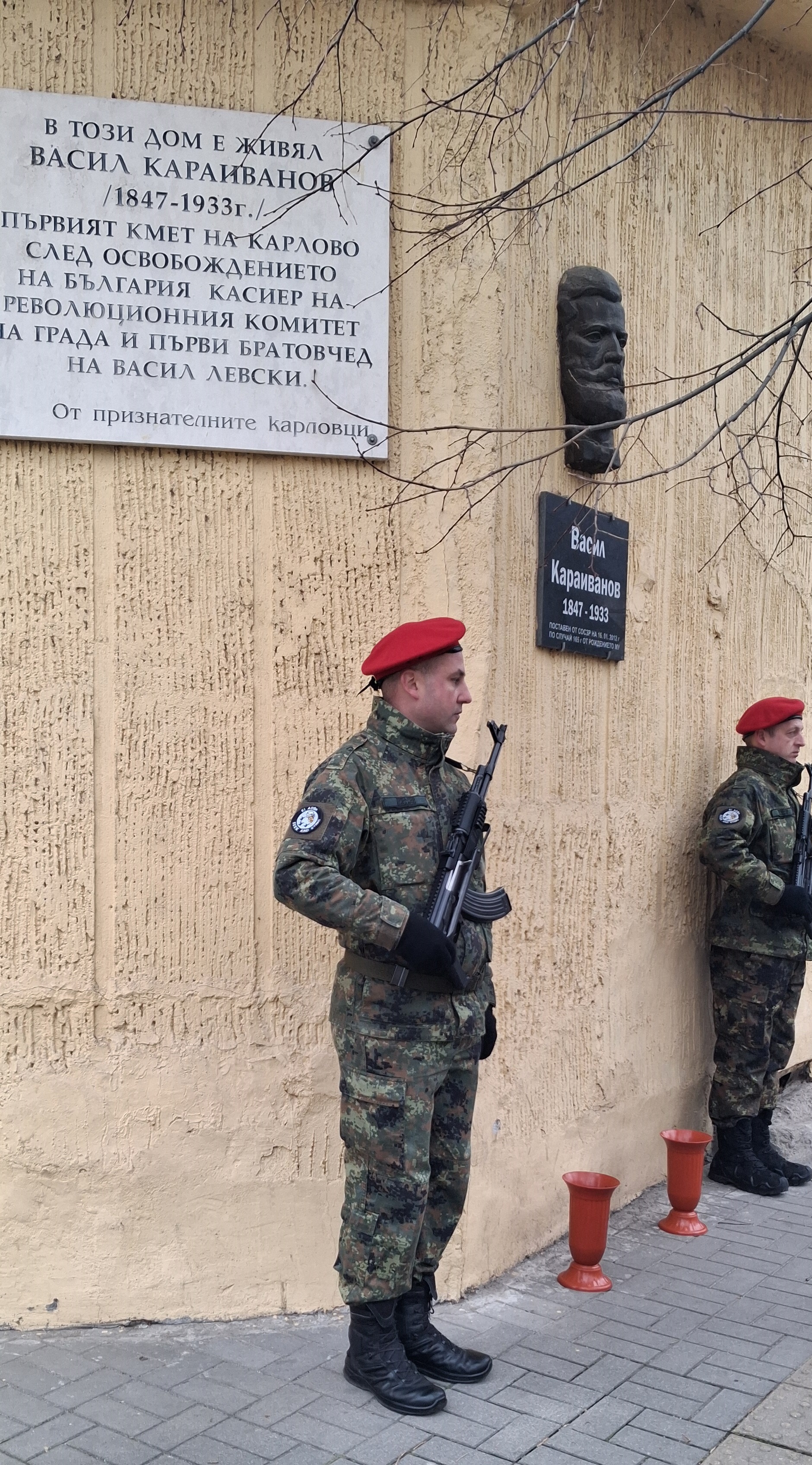 С военен ритуал бяха положени венци и цветя и пред паметната плоча на В. Караиванов, поставена на северната фасада на Община Карлово.