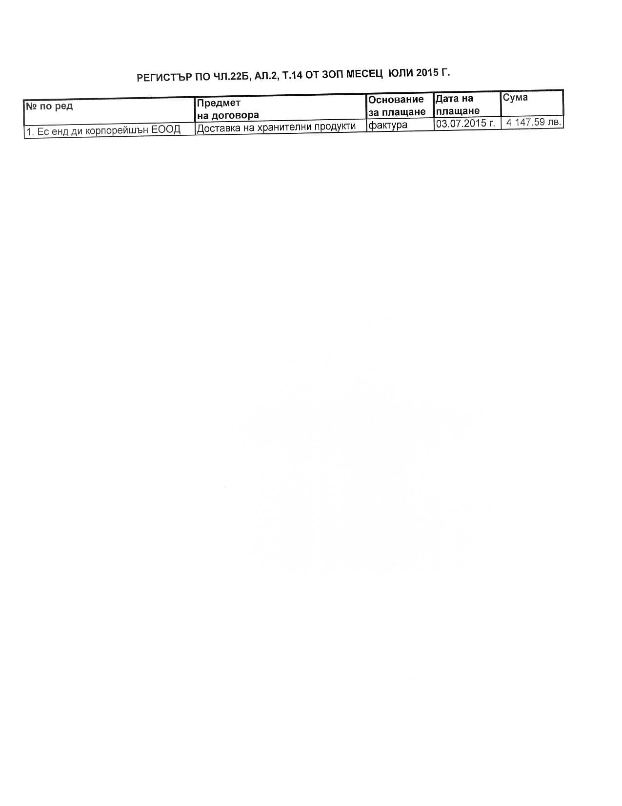 РЕГИСТЪР ПО ЧЛ.22Б,АЛ.2, Т.14 ОТ ЗОП М.07.2015 Г. ЦДГ ГИНА КУНЧЕВА