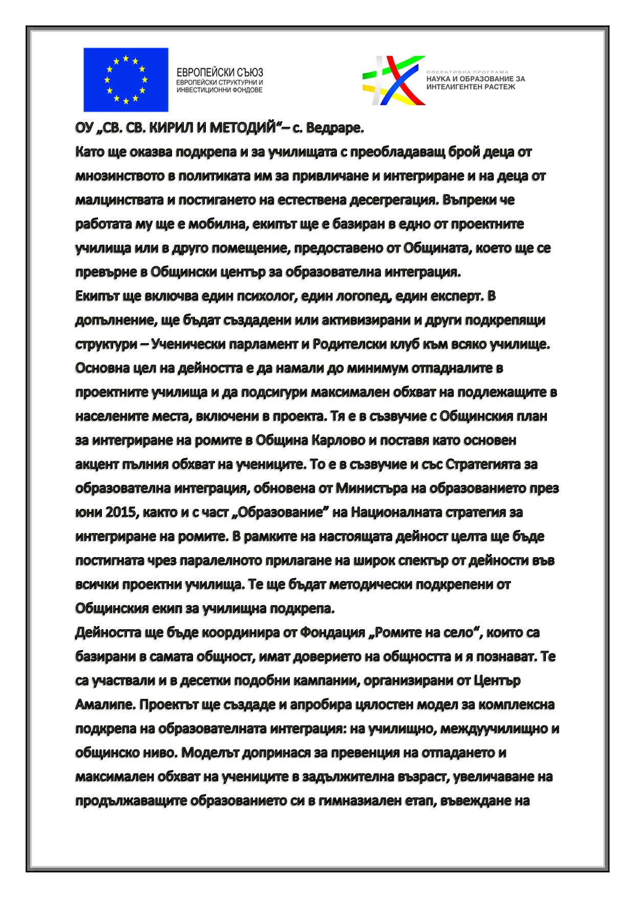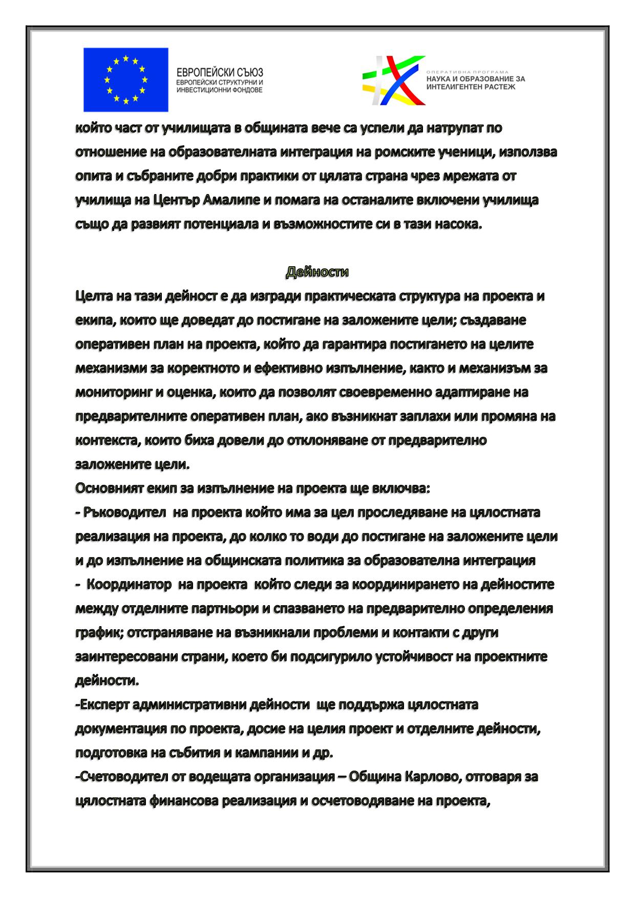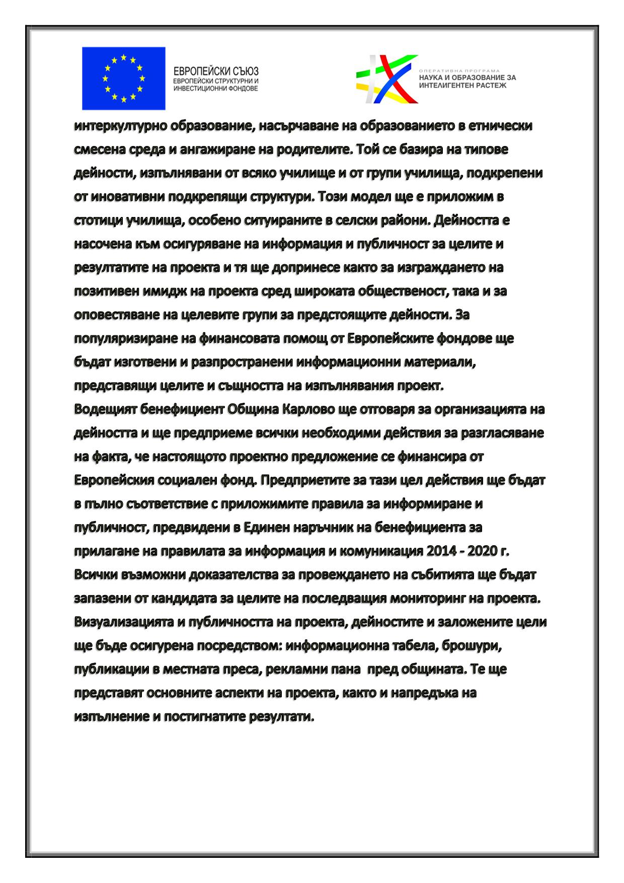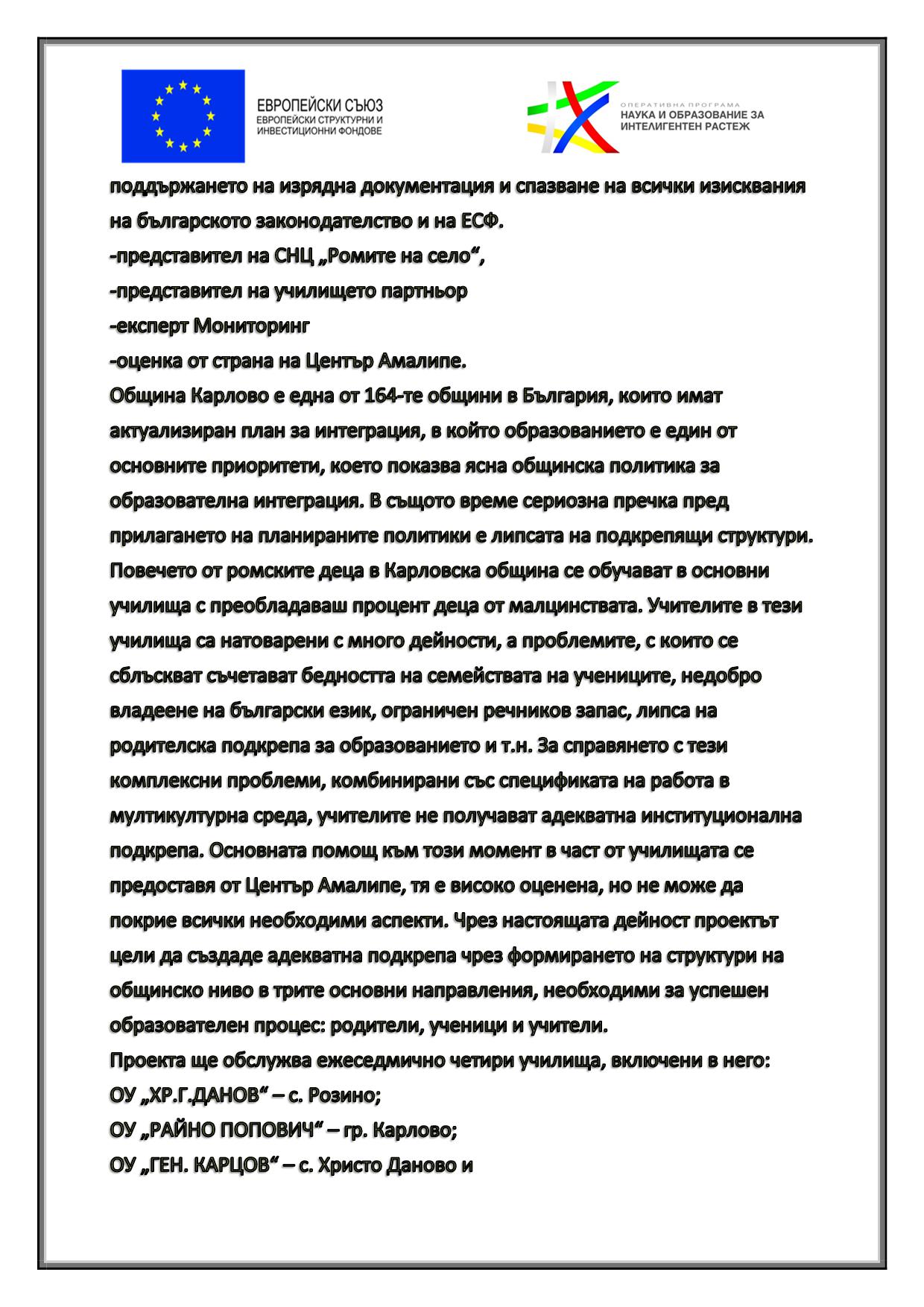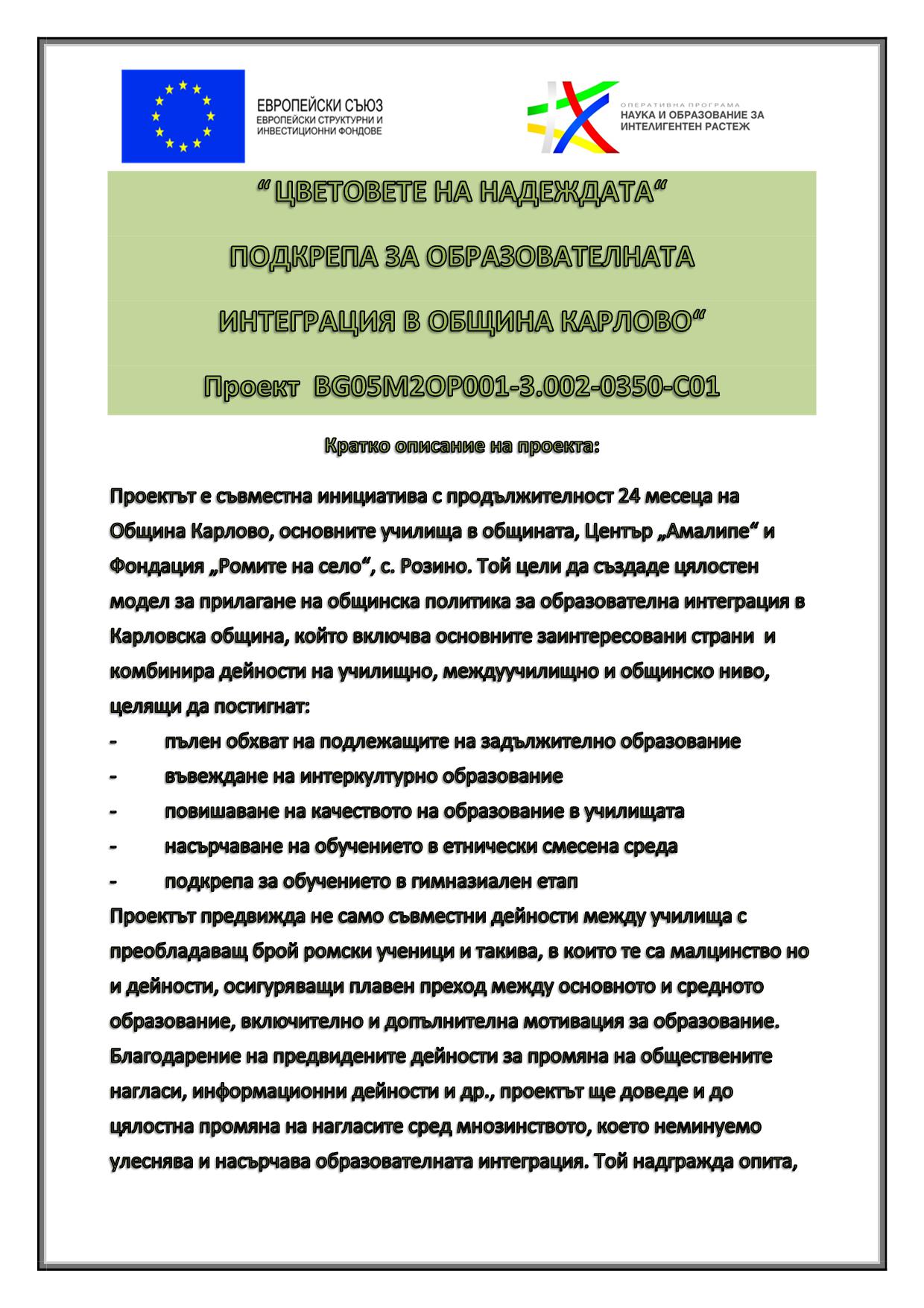 “ ЦВЕТОВЕТЕ НА НАДЕЖДАТА“ ПОДКРЕПА ЗА ОБРАЗОВАТЕЛНАТА ИНТЕГРАЦИЯ В ОБЩИНА КАРЛОВО“ Проект BG05M2OP001-3.002-0350-C01