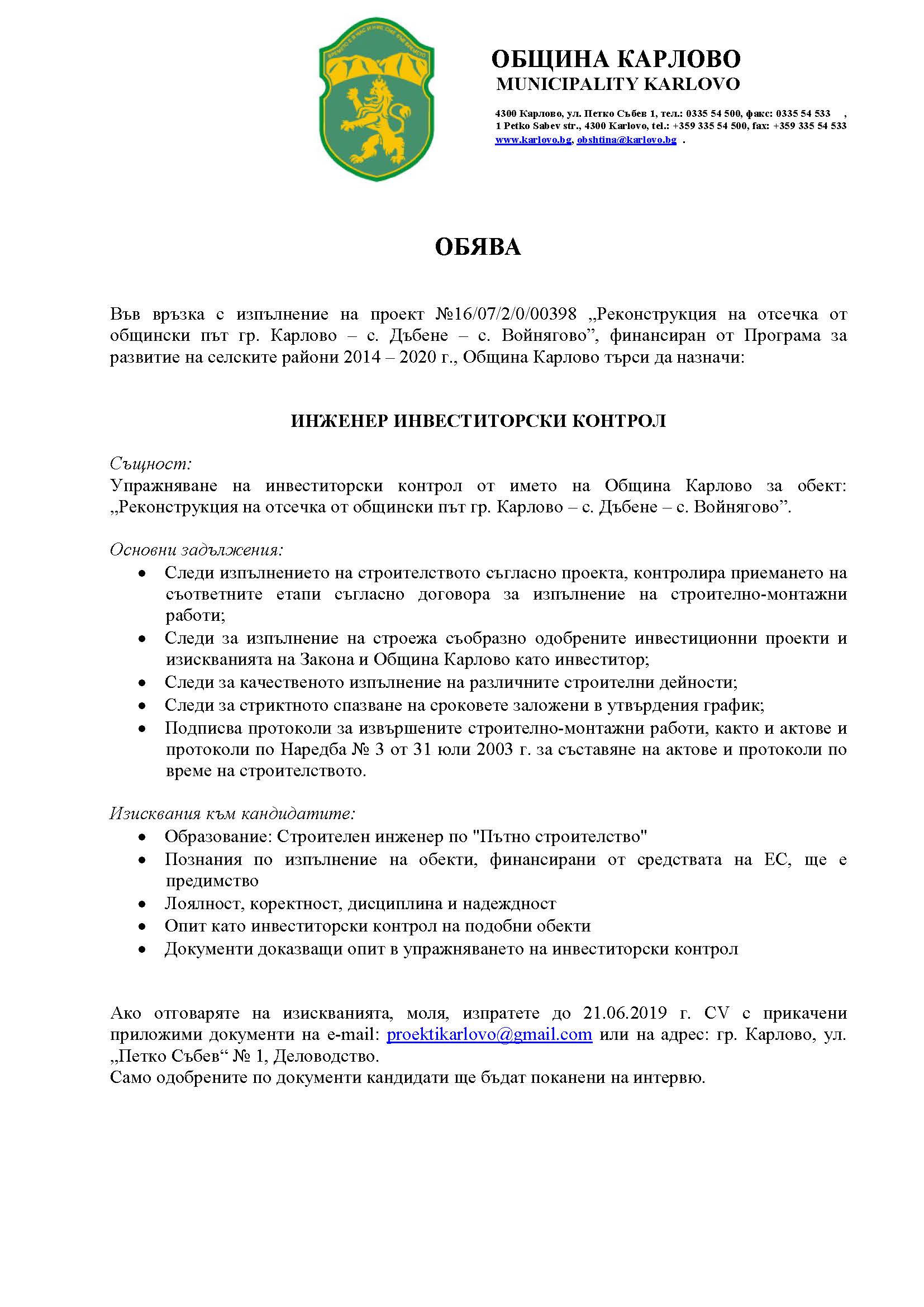 Във връзка с изпълнение на проект №16/07/2/0/00398 „Реконструкция на отсечка от общински път гр. Карлово – с. Дъбене – с. Войнягово”, финансиран от Програма за развитие на селските райони 2014 – 2020 г., Община Карлово търси да назначи инженер инвеститорски контрол