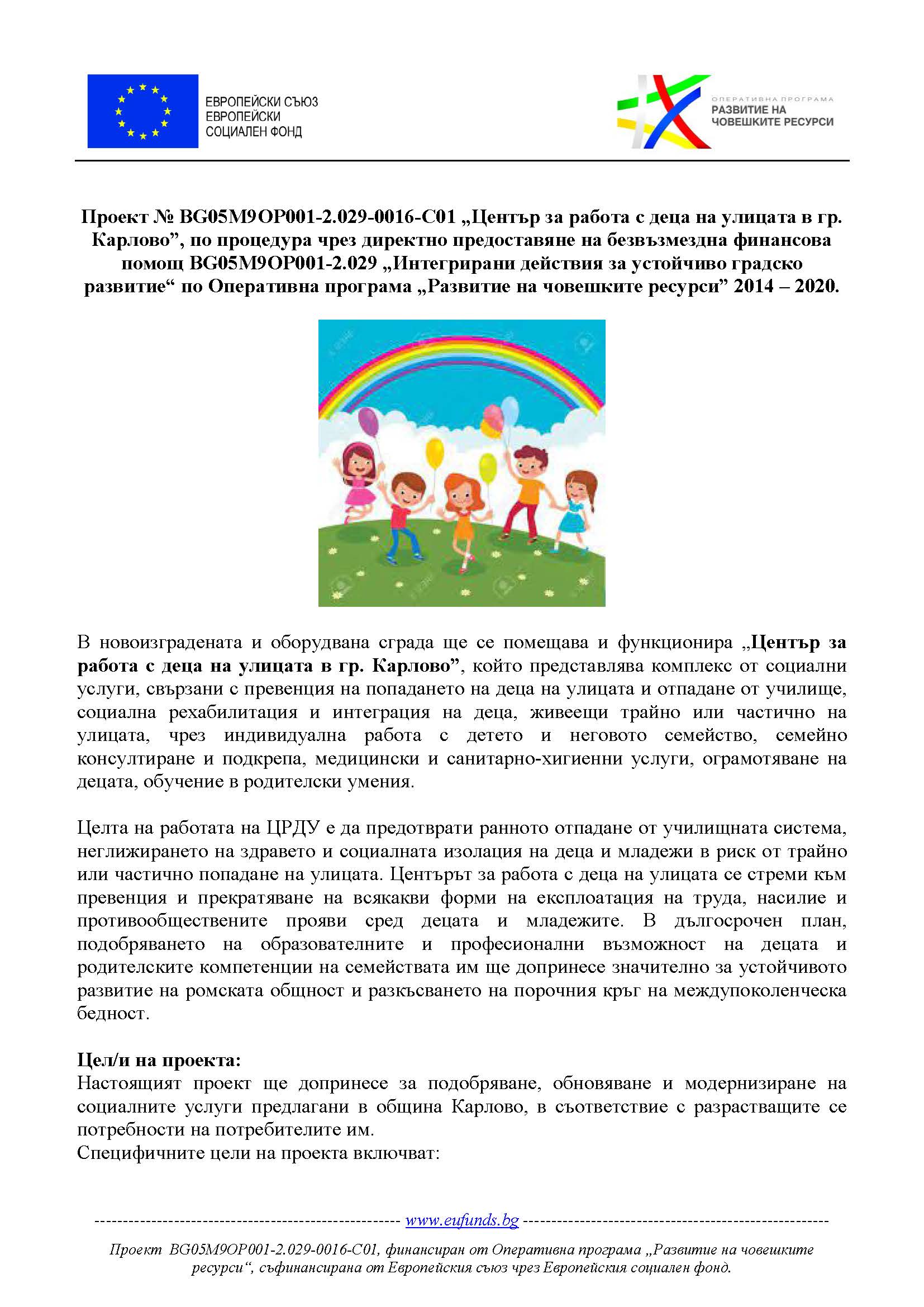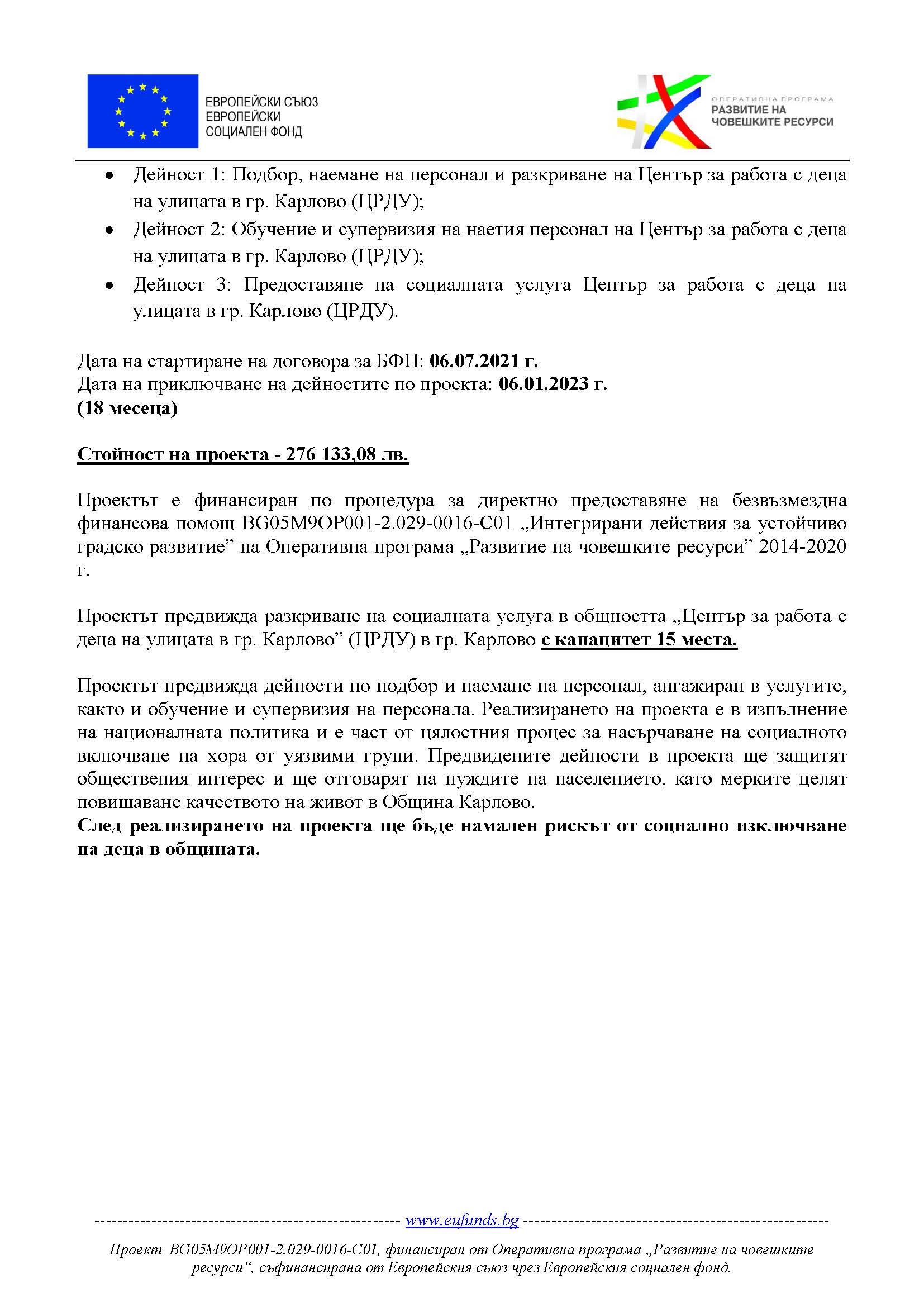 Проект № BG05M9OP001-2.029-0016-C01 „Център за работа с деца на улицата в гр. Карлово”, по процедура чрез директно предоставяне на безвъзмездна финансова помощ BG05M9OP001-2.029 „Интегрирани действия за устойчиво градско развитие“ по Оперативна програма „Развитие на човешките ресурси” 2014 – 2020.