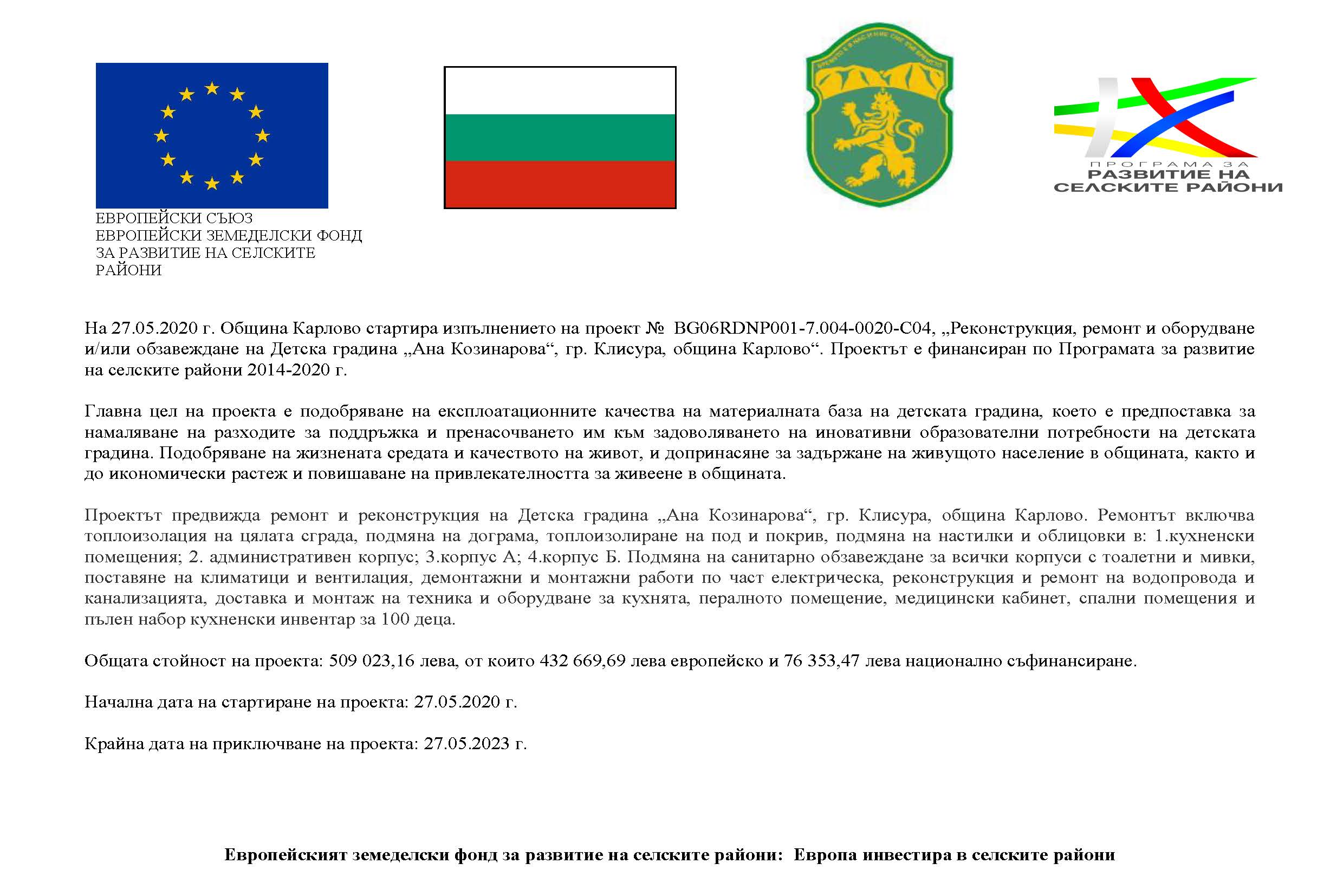 Проект № BG06RDNP001-7.004-0020-C04, „Реконструкция, ремонт и оборудване и/или обзавеждане на Детска градина „Ана Козинарова“, гр. Клисура, община Карлово“. Пр...
