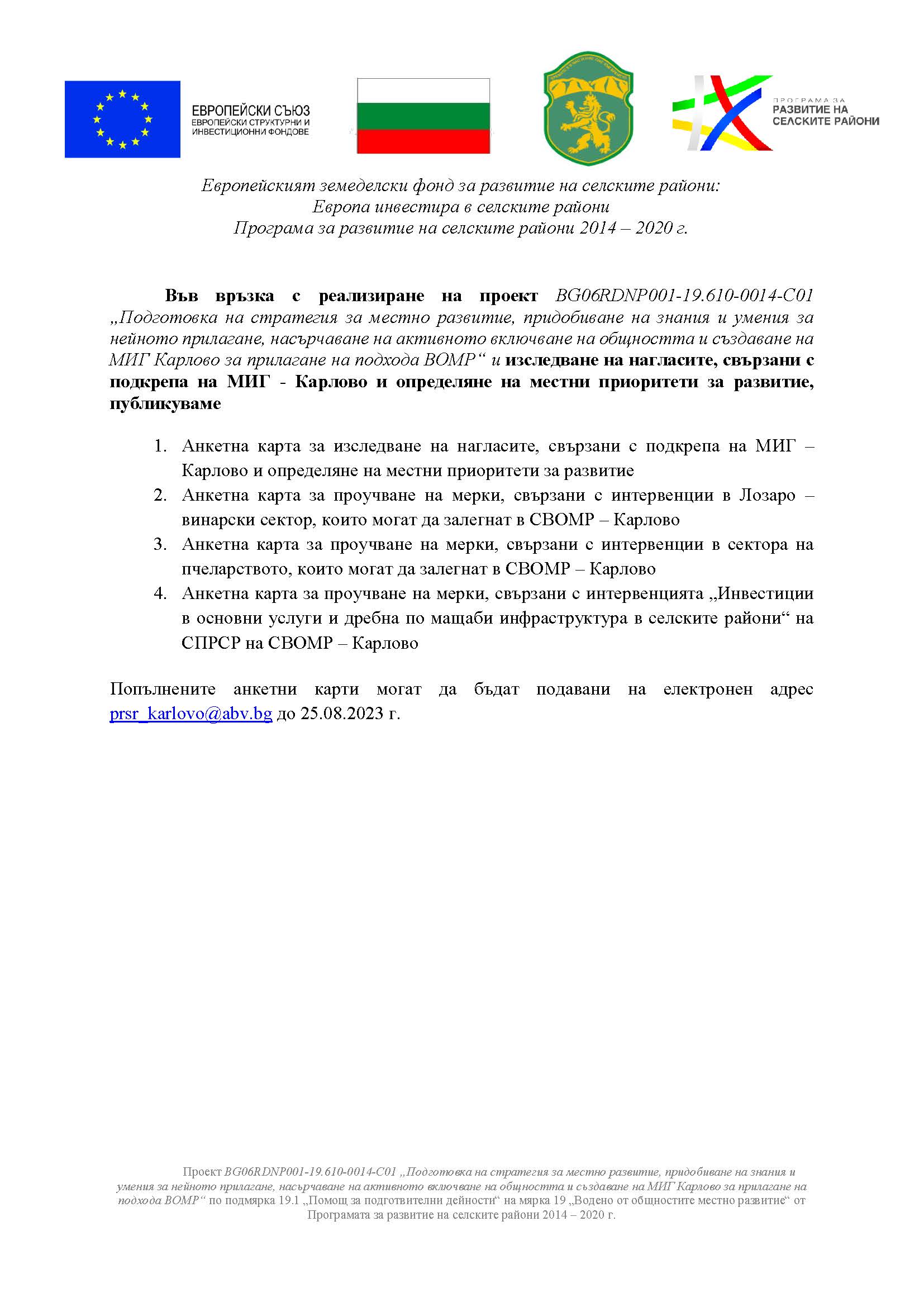 Попълнените анкетни карти могат да бъдат подавани на електронен адрес prsr_karlovo@abv.bg до 25.08.2023 г.