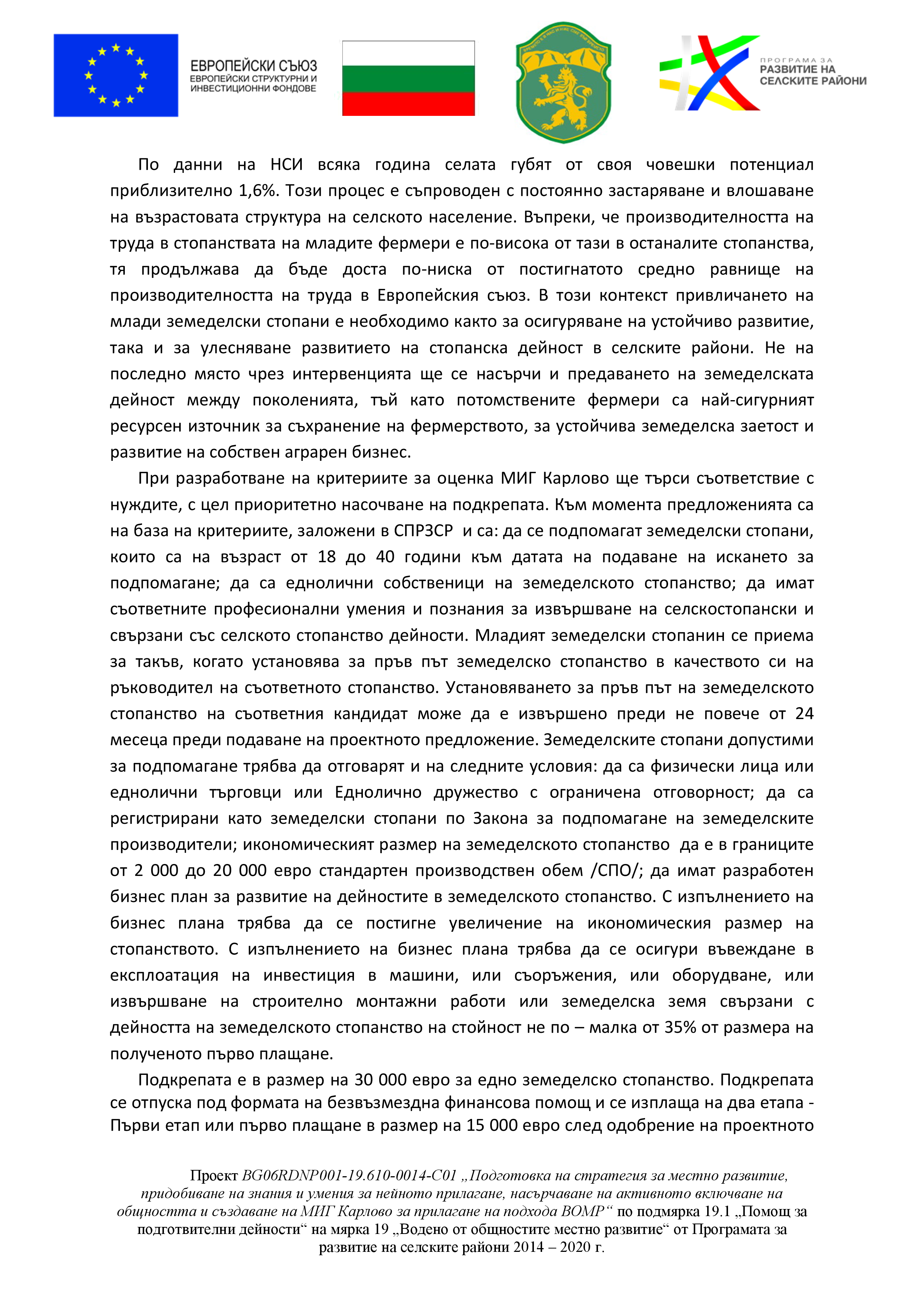 - „Стартова помощ за установяване на млади земеделски стопани в селското стопанство“ и