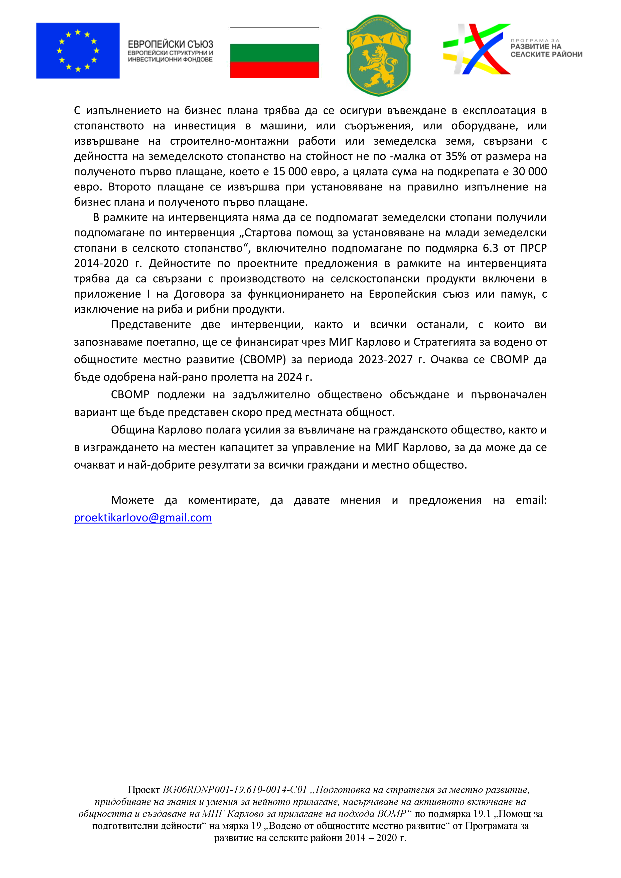 Стратегията за водено от общностите местно развитие (СВОМР) се разработва по проект BG06RDNP001-19.610-0014-C01 „Подготовка на стратегия за местно развитие, придобиване на знания и умения за нейното прилагане, насърчаване на активното включване на общността и създаване на МИГ Карлово за прилагане на подхода ВОМР“ по подмярка 19.1 „Помощ за подготвителни дейности“ на мярка 19 „Водено от общностите местно развитие“ от Програмата за развитие на селските райони 2014 – 2020 г.
