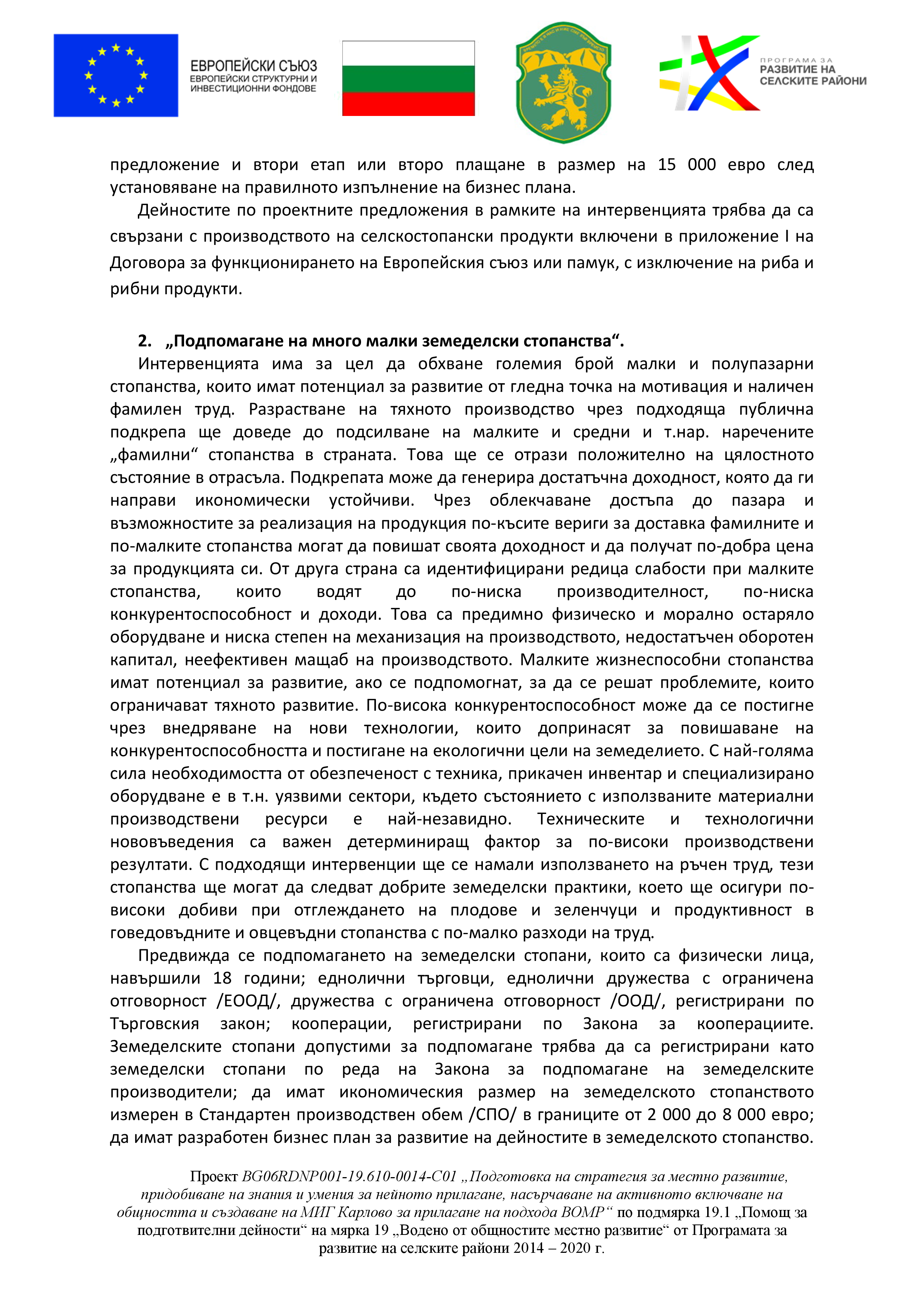 - „Подпомагане на много малки земеделски стопанства“.