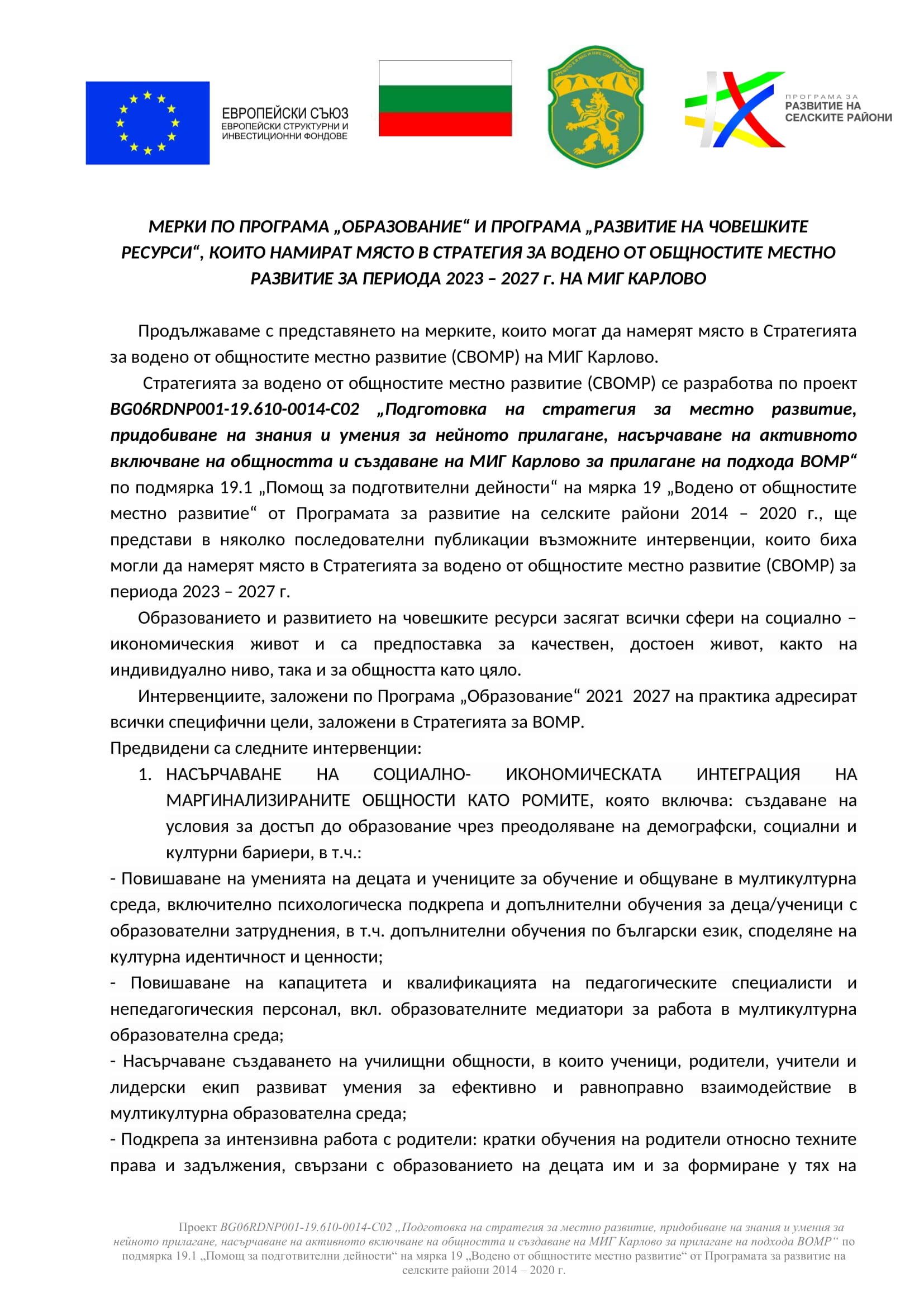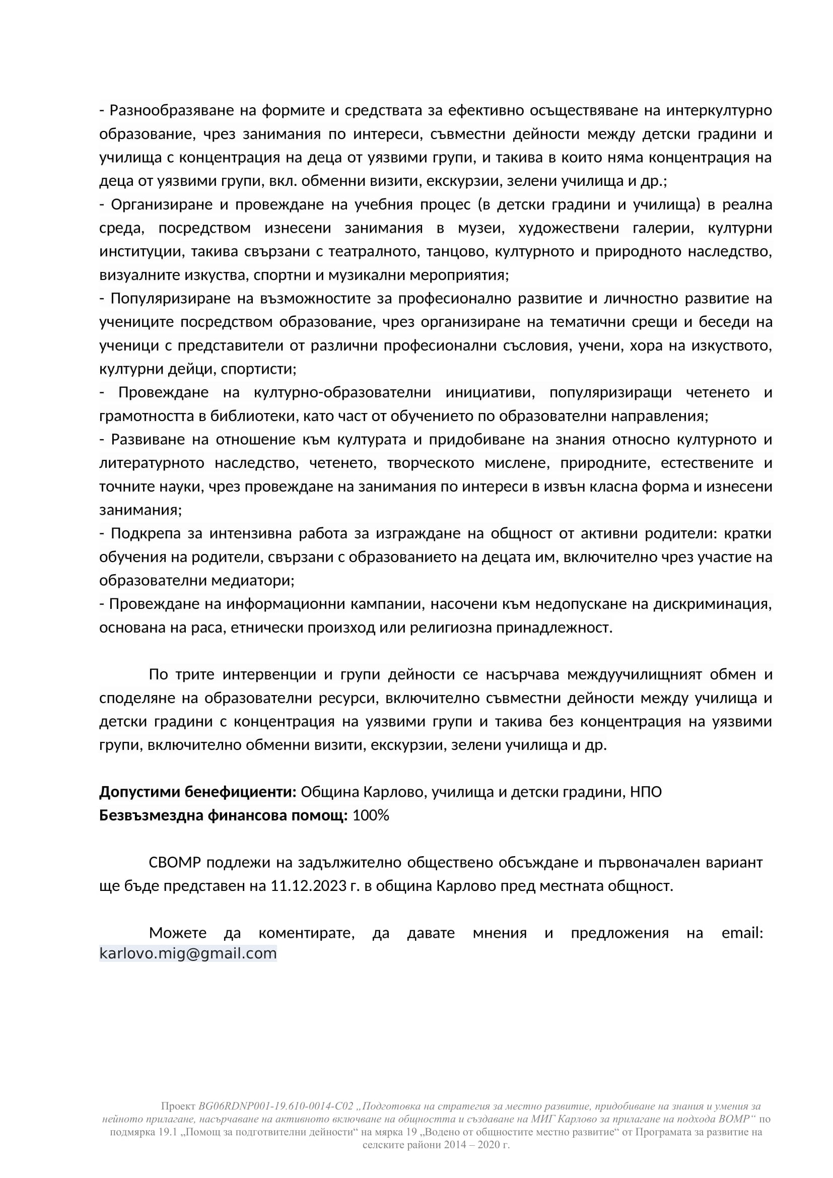 Мерки по програма „Образование“, които намират място в стратегия за водено от общностите местно развитие за периода 2023 – 2027 г. На МИГ Карлово