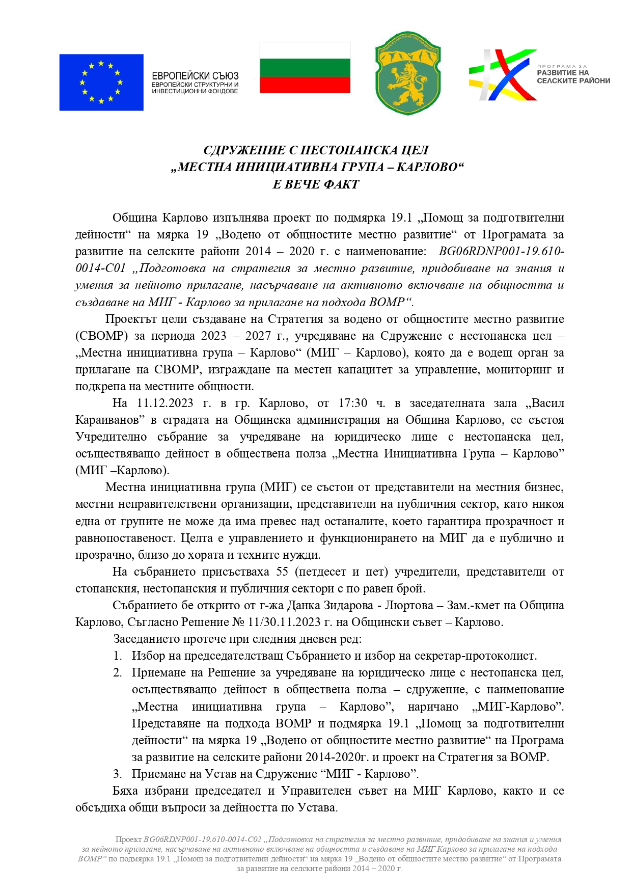 На 11.12.2023 г. в гр. Карлово, от 17:30 ч. в заседателната зала „Васил Караиванов” в сградата на Общинска администрация на Община Карлово, се състоя Учредително събрание за учредяване на юридическо лице с нестопанска цел, осъществяващо дейност в обществена полза „Местна Инициативна Група – Карлово” (МИГ –Карлово).