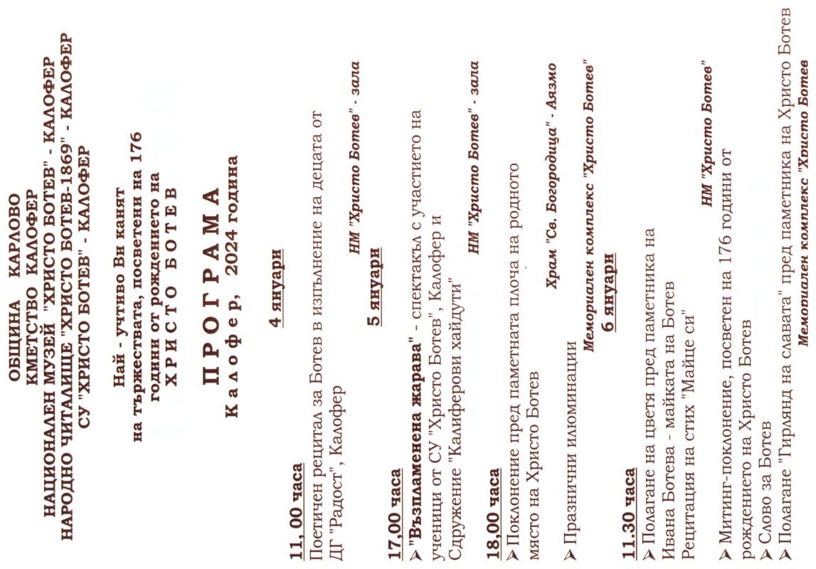 176 ГОДИНИ ОТ РОЖДЕНИЕТО НА ХРИСТО БОТЕВ - ПРОГРАМА
