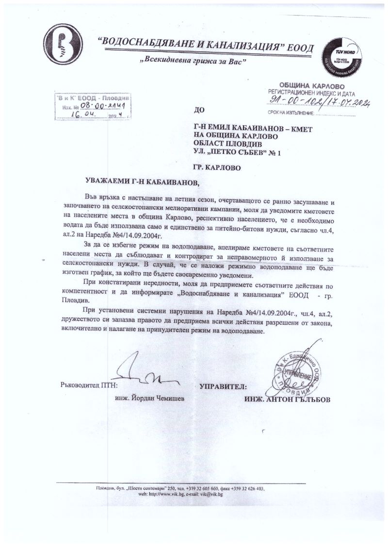 „ВиК“ ЕООД призовава: Използвайте водата само за питейно-битови нужди!