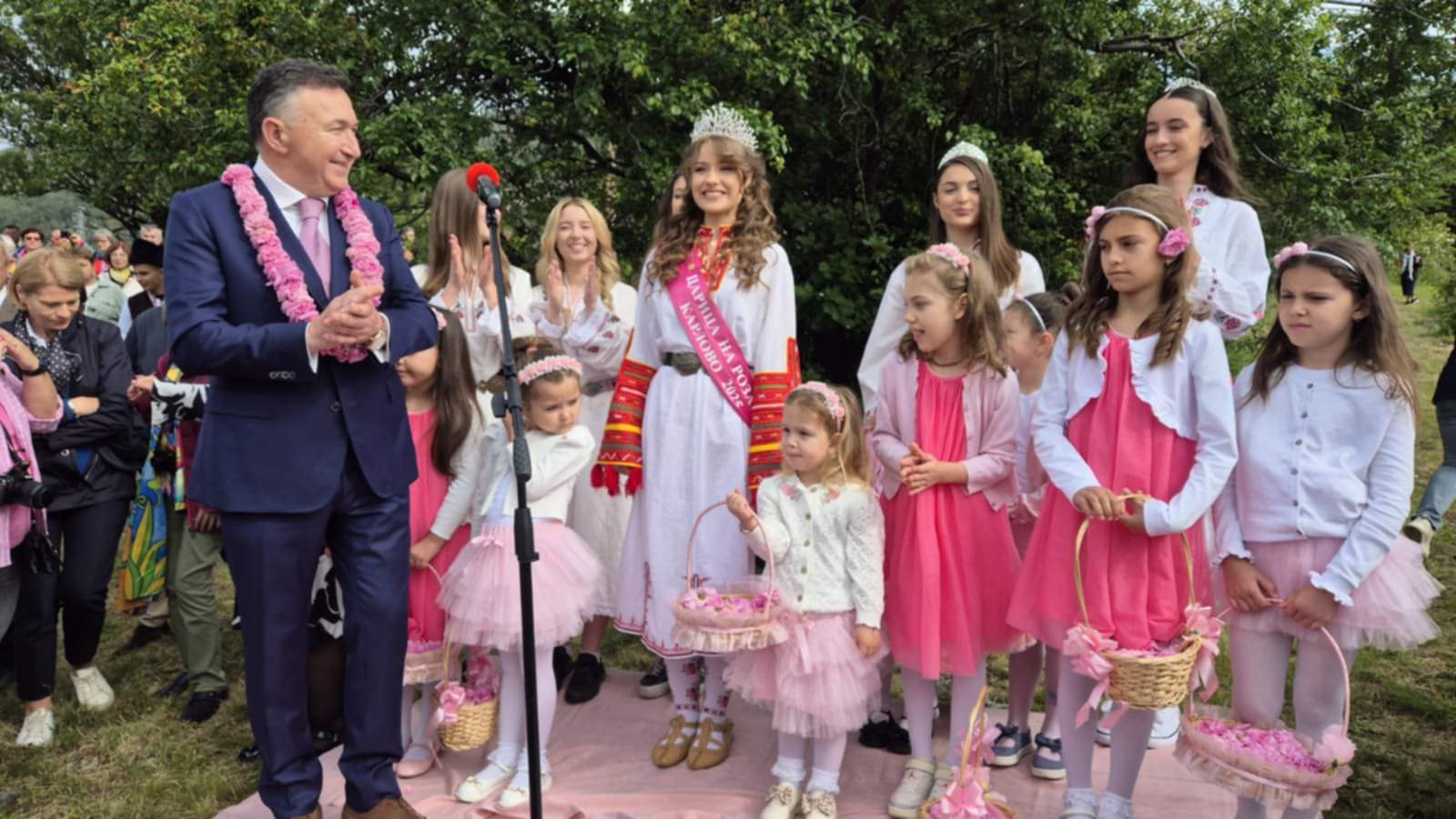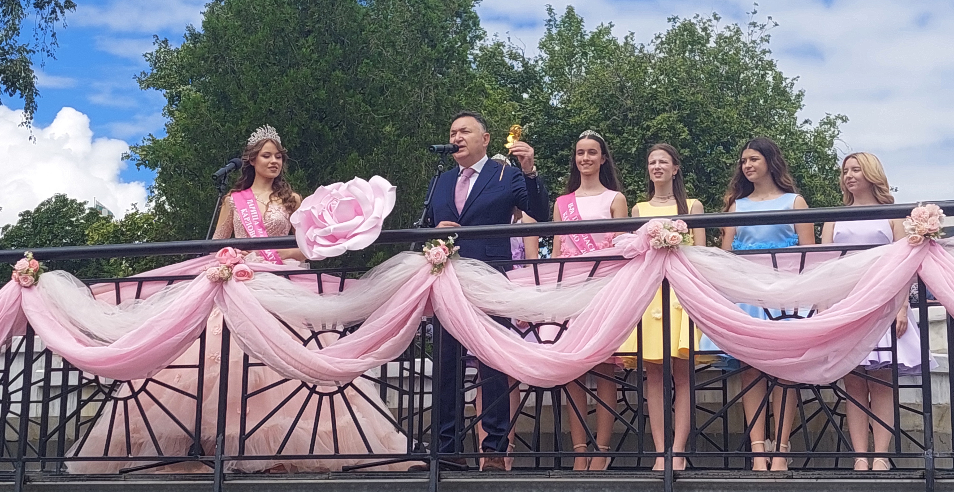 Приветствие отправи кметът на община Карлово д-р Емил Кабаиванов. „Скъпи съграждани, нека се чувстваме горди и нека самочувствието ни, което е оправдано, да нараства с този празник, защото – да ни почетат гости от партньорските градове в Европа, от Европейския парламент, от нашето Народно събрание, от българските държавни институции, гости от няколко континента… това говори едно: нашият град и Карловската долина на розите са известни в Европа и в света!.. Уважаеми гости на Празника на розата, ще ви кажа следното: хората от Карловския край от столетия отглеждат маслодайната роза. Отглеждат я като семеен бизнес, който и в добри, и в лоши селскостопански години осигурява прехраната на семействата им; средствата, с които те образоват своите деца… Ние, гражданите на Карлово и на цялата ни долина, се отнасяме с уважение и благодарност към всички, които сега, в не по-лека икономическа среда, продължават да отглеждат българската маслодайна роза. 2025-та е поредната година, в която благодарим и прекланяме глава пред стотиците карловци, които отглеждат рози. Пожелавам им да бъдат все така упорити, да са здрави и да имат успехи – те и техните семейства! Обръщам се към представителите на Европейския парламент с настойчива молба – нека интересите на розопроизводителите в Карловския регион, в цяла България да бъдат защитени! Сигурни сме, че ще направите всичко необходимо, за да може столетия след нас българската маслодайна роза да бъде емблема на красивата ни родина.“, каза д-р Кабаиванов. Той връчи на Царицата на розата един от символите на Карлово – 24-каратовата Златна роза. Никол да бъде посланик в България и в чужбина на красотата, на Розовата долина и на Карлово, пожела д-р Кабаиванов. Никол приветства стотиците, изпълнили площада, с добре дошли, пожела здраве и доброта и повели да бъде ден на радост и веселие.