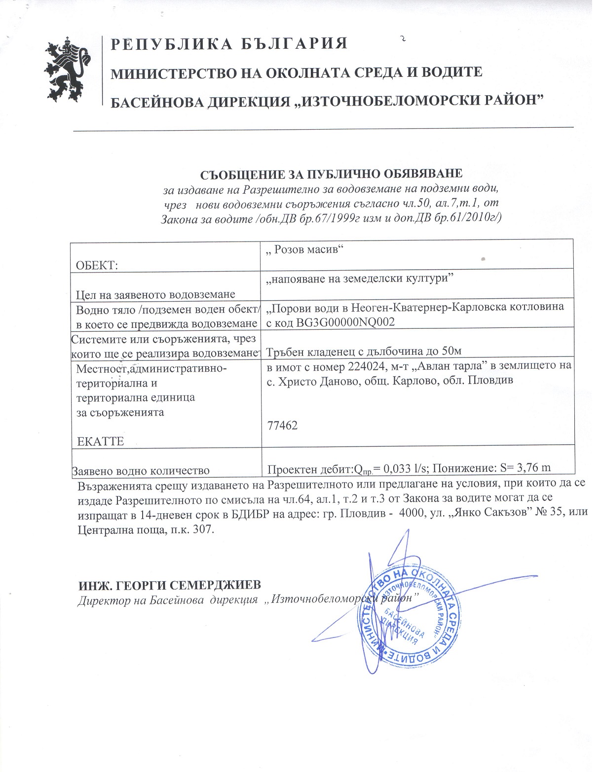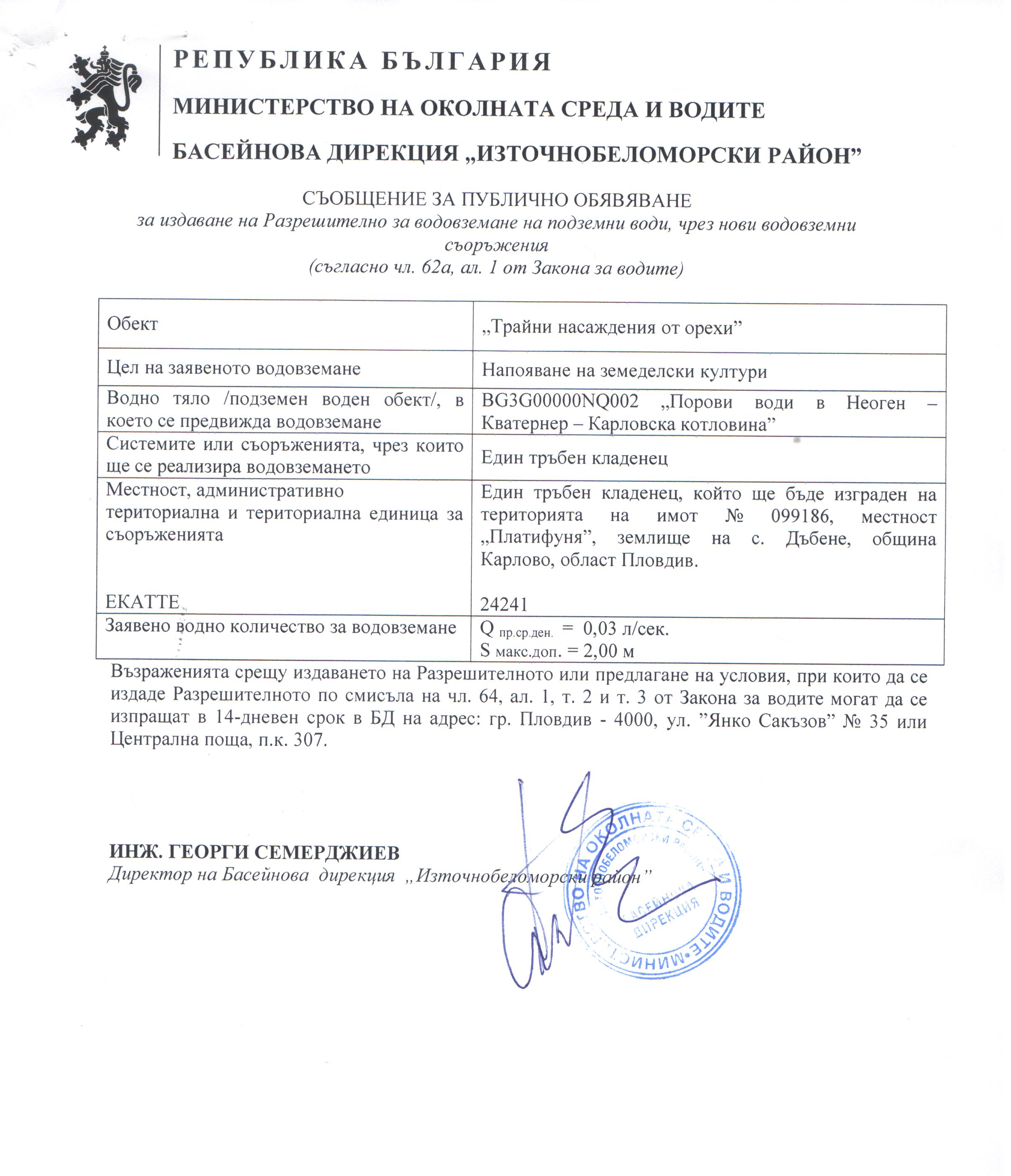 Съобщение за публично обявяване за издаване на Разрешително за водовземане на подземни води, чрез нови водовземни съоръжения