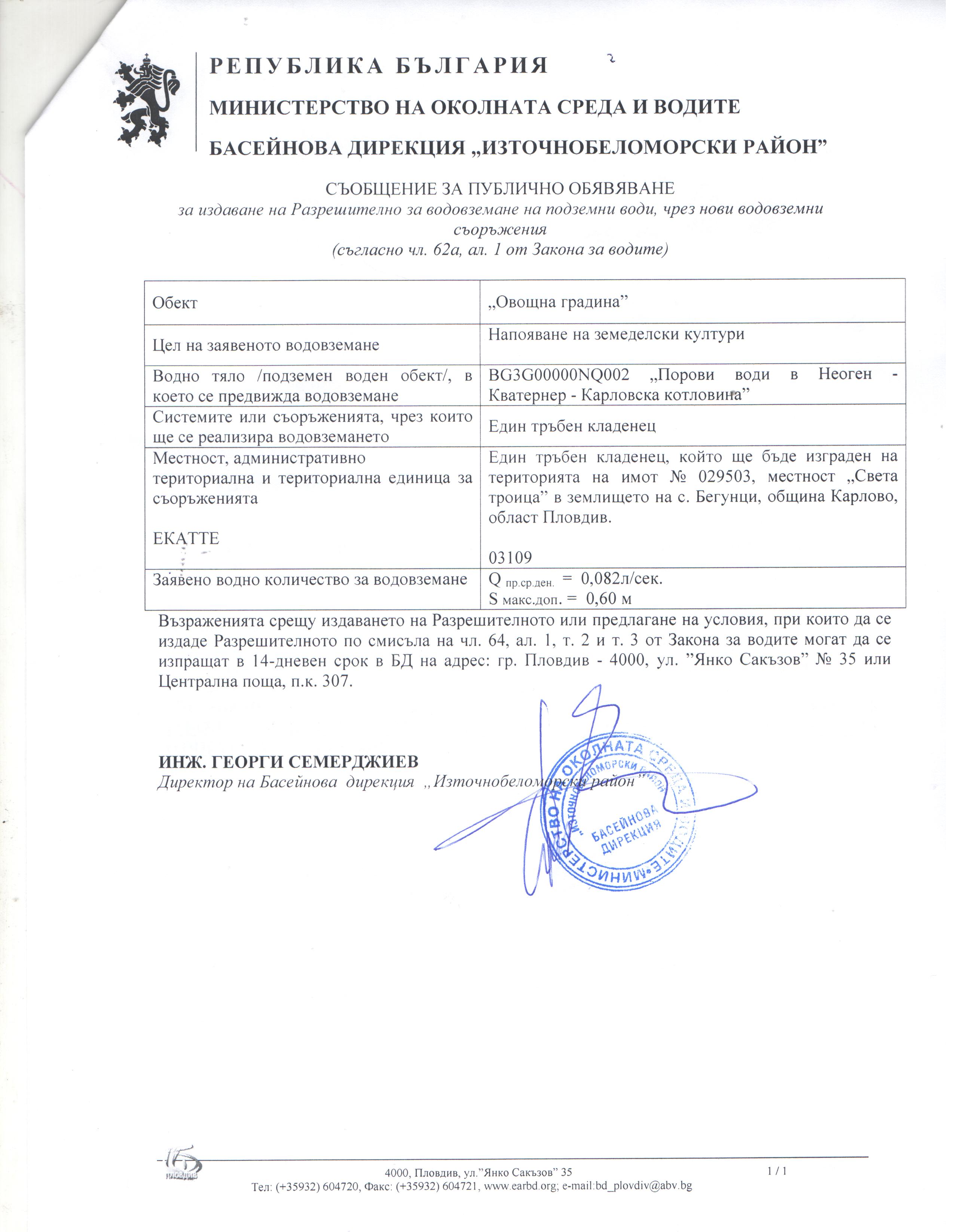 Съобщение за публично обявяване за издаване на Разрешително за водовземане на подземни води, чрез нови водовземни съоръжения с. Бегунци