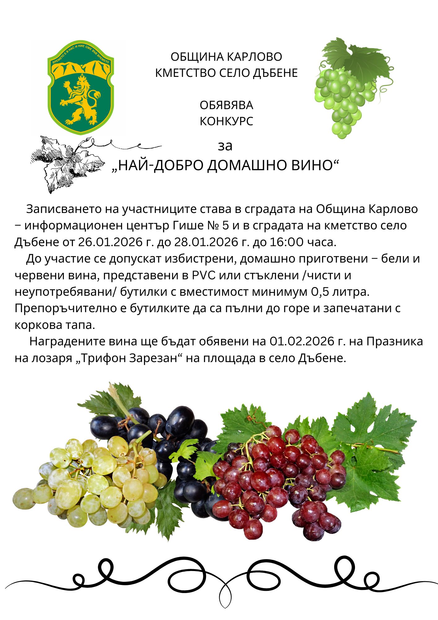 Заповядайте на традиционния празник на лозаря „Трифон Зарезан“, който тази година ще се проведе на 1-ви февруари в село Дъбене!